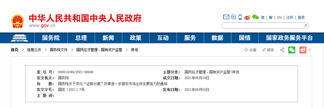 國務(wù)院關(guān)于深化“證照分離”改革 進(jìn)一步激發(fā)市場主體發(fā)展活力的通知