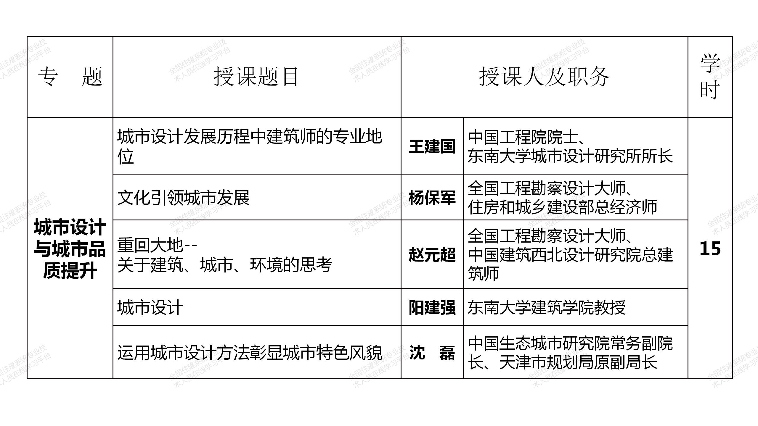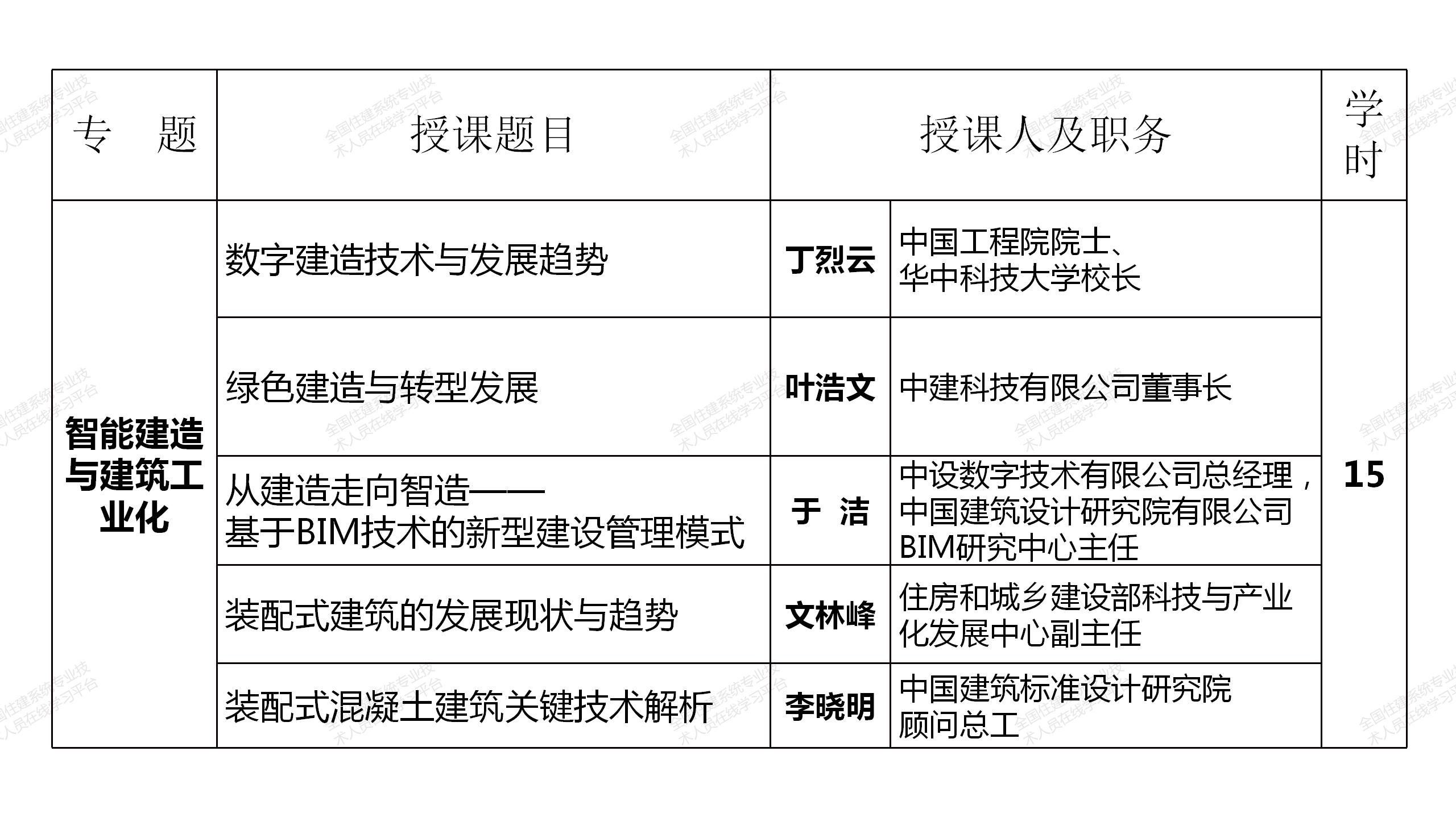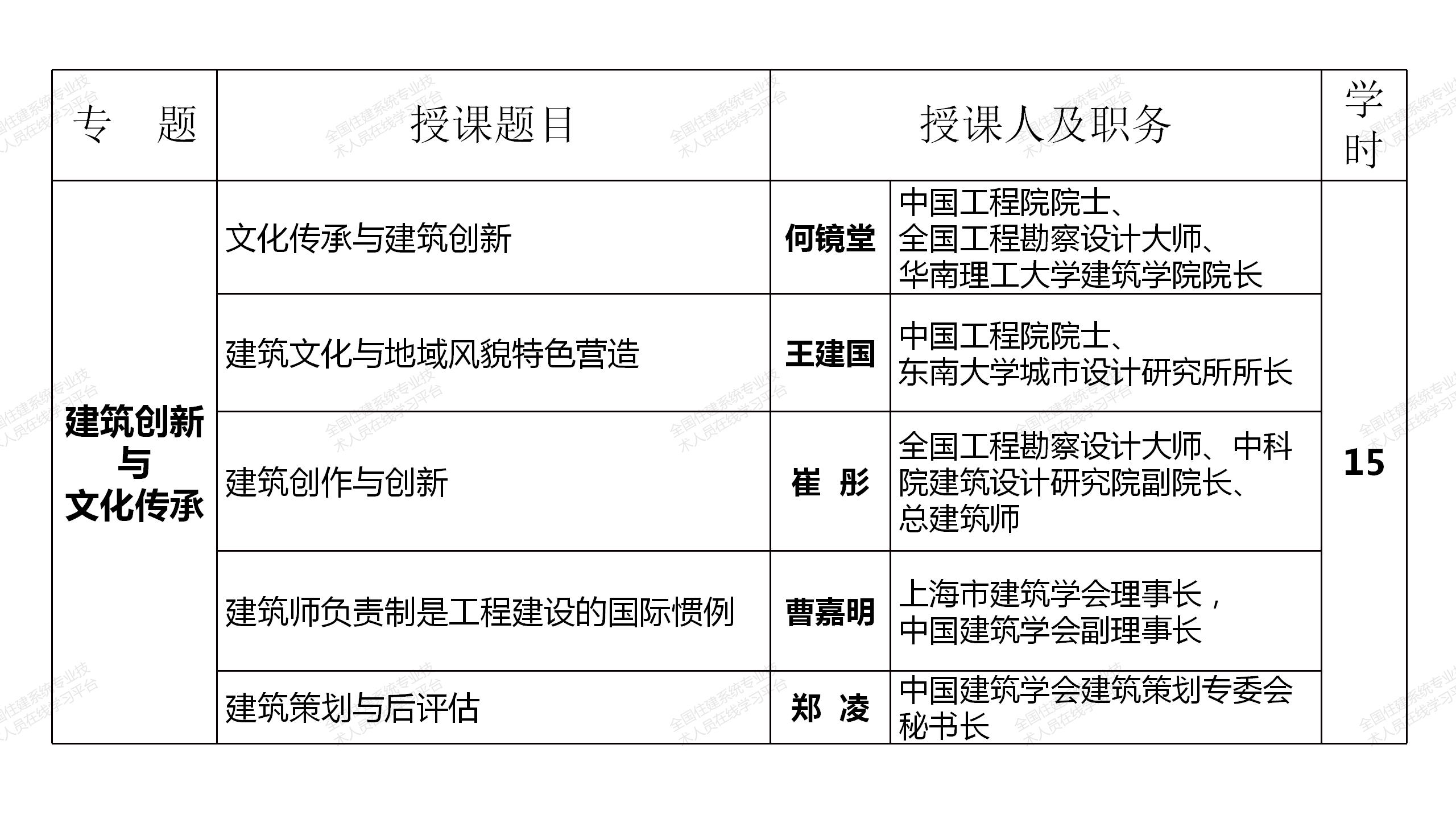 網(wǎng)絡(luò)選修課程由中國工程院院士、全國工程勘察設(shè)計大師和建筑領(lǐng)域著名專家、住房和城鄉(xiāng)建設(shè)部有關(guān)領(lǐng)導(dǎo)主講,分政策解讀、城市設(shè)計與城市品質(zhì)提升、建筑創(chuàng)新與文化傳承、綠色建筑與建筑節(jié)能、智能建造與建筑工業(yè)化和建筑防火設(shè)計6個專題共85學(xué)時(見附表),注冊建筑師可根據(jù)自身需要選擇其中40學(xué)時學(xué)習(xí),其中10學(xué)時的政策解讀專題課程免費提供,并可計入繼續(xù)教育學(xué)時。課程緊密結(jié)合國務(wù)院、住房和城鄉(xiāng)建設(shè)部近年發(fā)布的有關(guān)行業(yè)改革、裝配式建筑、建筑工業(yè)化、智能建造等重大政策,緊跟國家形勢發(fā)展需要,是一套集權(quán)威性、系統(tǒng)性、針對性、實效性于一體的建筑領(lǐng)域頂尖課程。選修課程于2021年7月12日在“全國住建系統(tǒng)專業(yè)技術(shù)人員在線學(xué)習(xí)平臺”(http://www.mayortraining.net)正式上線。