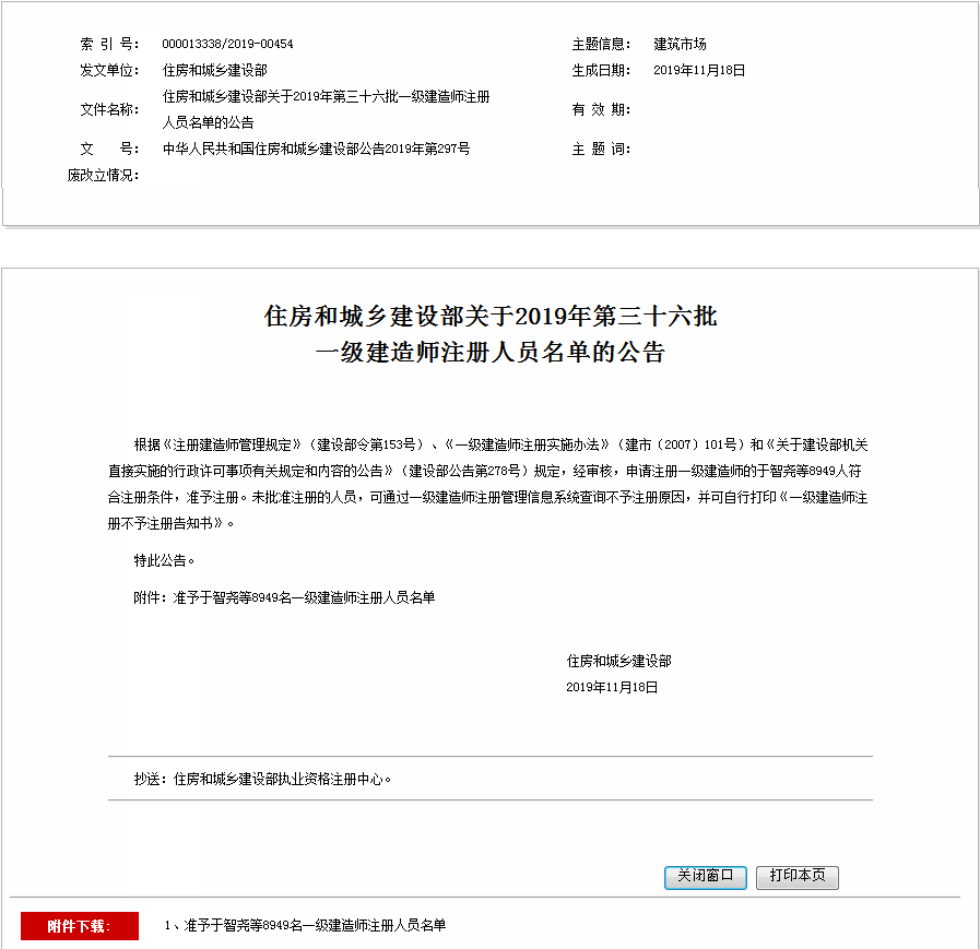 住房和城鄉(xiāng)建設(shè)部關(guān)于2019年第三十六批 一級建造師注冊人員名單的公告